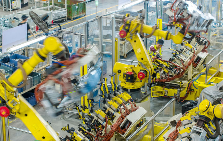 2025年10月9日,浙江省湖州市長興經(jīng)濟技術開發(fā)區(qū)的長興地通汽車部件有限公司技術人員操控工業(yè)機器人生產(chǎn)新能源汽車配件(無人機照片)。新華社發(fā)(譚云俸攝)