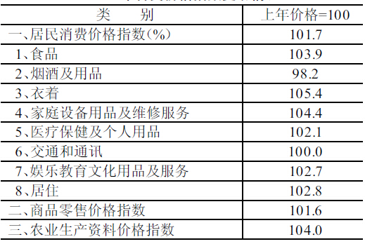 居民消費(fèi)價(jià)格總指數(shù)上漲1.7%,其中:食品價(jià)格上漲3.9%,居住價(jià)格上漲2.8%。
