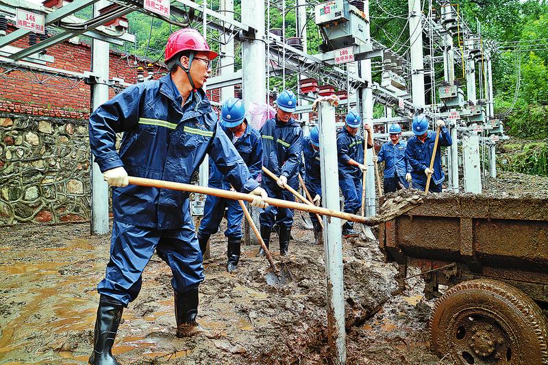 7月24日,國(guó)網(wǎng)商洛供電公司變電檢修中心共產(chǎn)黨員突擊隊(duì)在洛南災(zāi)區(qū)開展搶修作業(yè)。洛南縣洛源鎮(zhèn)35千伏洛源變因“7·23”暴雨導(dǎo)致北側(cè)圍墻被雨水滑坡沖倒,大量淤泥漫入變電站院內(nèi),普遍深度達(dá)50厘米左右,該公司第一時(shí)間組織人員、物資趕赴現(xiàn)場(chǎng),展開清淤工作,以保證設(shè)備具備正常運(yùn)行條件。當(dāng)晚,黑彰線成功送電。(雷蕾 攝)