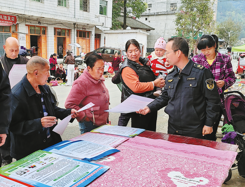 近日,市農(nóng)業(yè)綜合執(zhí)法支隊(duì)組織工作人員到山陽、洛南等縣區(qū)開展秋季農(nóng)資經(jīng)營指導(dǎo)工作,向群眾普及涉農(nóng)法律法規(guī)和種子、農(nóng)藥等重點(diǎn)農(nóng)資選購知識(shí)。圖為工作人員在山陽縣色河鋪鎮(zhèn)發(fā)放宣傳資料。 (本報(bào)通訊員 白凈 攝)