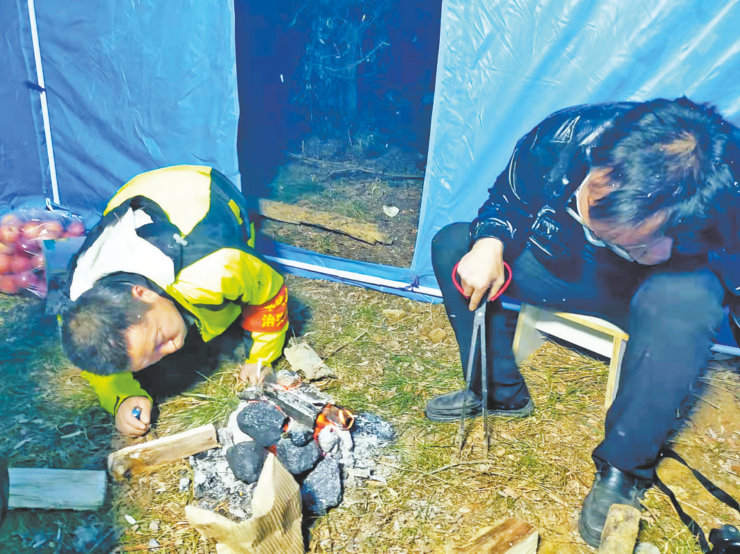 孫錚亮(左一)和志愿者晚間在疫情防控排查點(diǎn)值守時(shí),生火取暖。