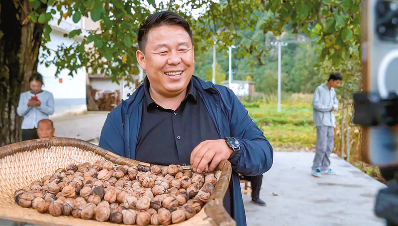 薛超正在對著手機(jī)直播,將村民的核桃、木耳等農(nóng)產(chǎn)品通過網(wǎng)絡(luò)平臺(tái)銷售出去。