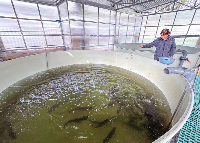 走出民宿區(qū),順著村路往前走,很快就能看到七星村的特色產(chǎn)業(yè)——七星村家庭版冷水魚養(yǎng)殖示范項目。封閉式的大棚內(nèi),安置著4個直徑5米的圓形養(yǎng)魚池,分別養(yǎng)著虹鱒和鱘魚兩種冷水魚。60歲的技術(shù)人員劉巧利正在給魚喂食:“我每天來給魚喂食、消毒等?;旧线@里的魚都是供給村里的農(nóng)家樂了。”