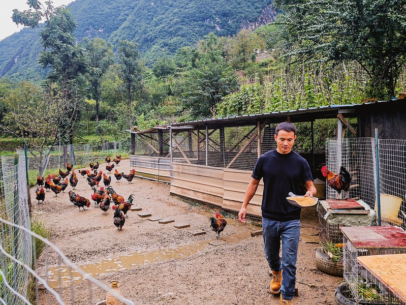 9月19日,青槐社區(qū)居民張永濤在雞舍喂雞。